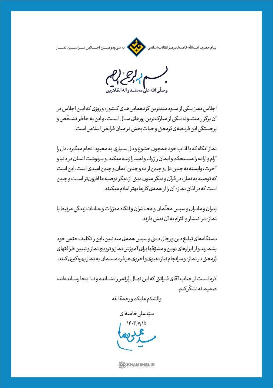 متن پیام رهبر انقلاب اسلامی به این شرح است:
