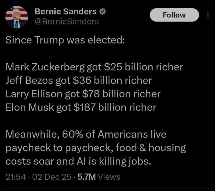 از وقتی ترامپ انتخاب شد: مارک زاکربرگ ۲۵ میلیارد دلار ثروتمندتر شد جف بیزوس ۳۶ میلیارد دلار پولدارتر شد لَری اِلیسون ۷۸ میلیارد دلار به دارایی‌هاش اضافه شد.ایلان ماسک ۱۸۷ میلیارد دلار ثروتمندتر شد در همین حال، ۶۰ درصد مردم آمریکا در تأمین مخارج زندگی هشتشان گروی نهشان است، هزینهٔ غذا و مسکن سر به فلک کشیده و هوش مصنوعی دارد شغل‌ها را می‌بلعد.