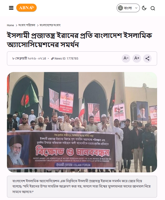 این بیانیه در حالی صادر شد که انجمن اسلامی بنگلادش این هفته پس از نماز جمعه، راهپیمایی مسالمت‌آمیزی در مقابل دروازه شمالی مسجد ملی بیت‌المکرم برگزار کرد. این تجمع در اعتراض به طرح تجاوز نظامی آمریکا علیه جمهوری اسلامی ایران و تهدید به ترور رهبر معظم انقلاب شکل گرفت.