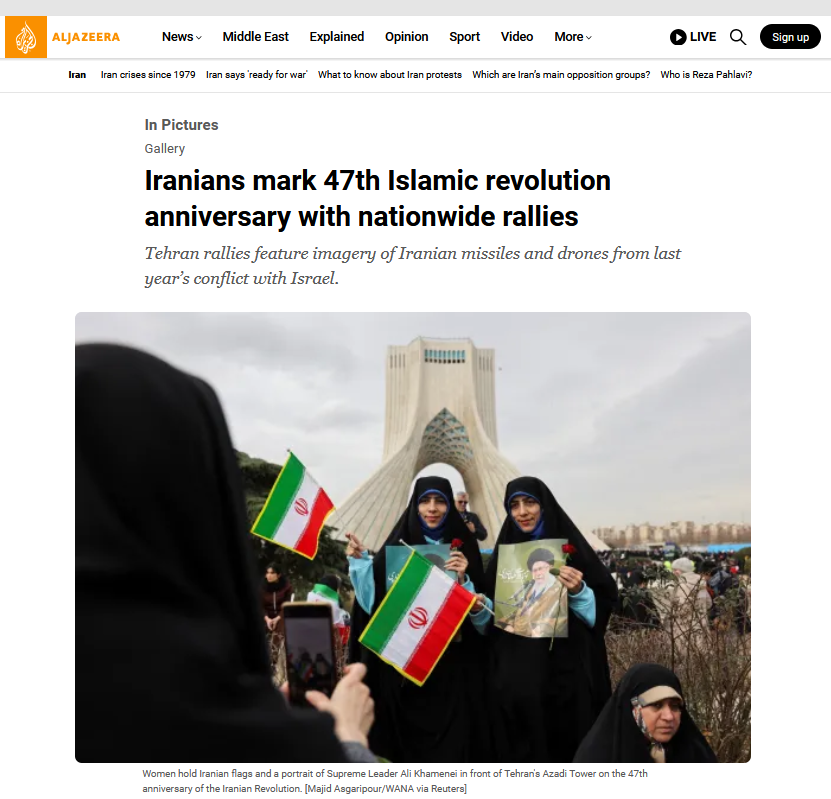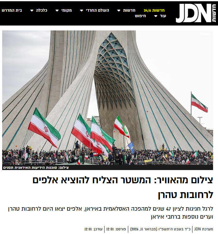 وب سایت عبری زبان jdn.co با اشاره به برگزاری مراسم پیروزی سالگرد انقلاب اسلامی ایران نوشت: در ۴۷ سالگی انقلاب ایران، راهپیمایی‌های گسترده‌ای امروز در سراسر ایران آغاز شد. تظاهرکنندگان پرچم‌های ایران را حمل می‌کردند و علیه اسرائیل و آمریکا شعار دادند.