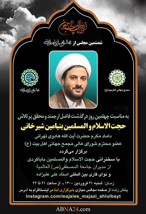 به گزارش خبرگزاری اهل بیت(ع) ـ ابنا ـ شصت و یکمین مجلس از مجالس مجازی اهل بیتی در شامگاه شنبه ۲۱ فروردین ۱۴۰۰ به مناسبت چهلمین روز درگذشت مرحوم حجت الاسلام و المسلمین «بنیامین شیرخانی» داماد آیت الله «هادوی تهرانی» عضو محترم شورای عالی مجمع جهانی اهل بیت(ع) برگزار شد. در این مراسم که به همت مجمع جهانی اهل بیت(ع) و به شکل مجازی بر پا گردید، حجت الاسلام و المسلمین«باباکردی» از مدیران جامعة المصطفى العالمية به ایراد سخن پرداخت.