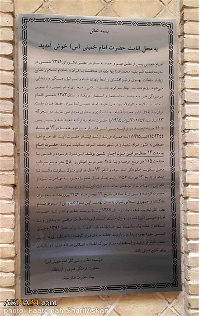 به گزارش خبرگزاری اهل‌بیت(ع) - ابنا - بیت امام خمینی(ره) در مجاورت بارگاه امیرالمؤمنین علی(ع)، منزلی تاریخی است که در جنوب شهر قدیم نجف، در بخش غربی "شارع الرسول(ص)" و در نزدیکی "کتابخانه و مقبره علامه امینی" واقع‌شده است. امام خمینی(ره) حدود ۱۳ سال در این منزل زندگی کرد. این مکان که محل رهبری بزرگ‌ترین انقلاب قرن گذشته بود، اکنون تبدیل به موزه شده است. زائران اربعین ۱۴۴۴ با حضور در این منزل، در حال و هوای آن سال‌های حیات امام راحل(ره) قرار گرفتند.