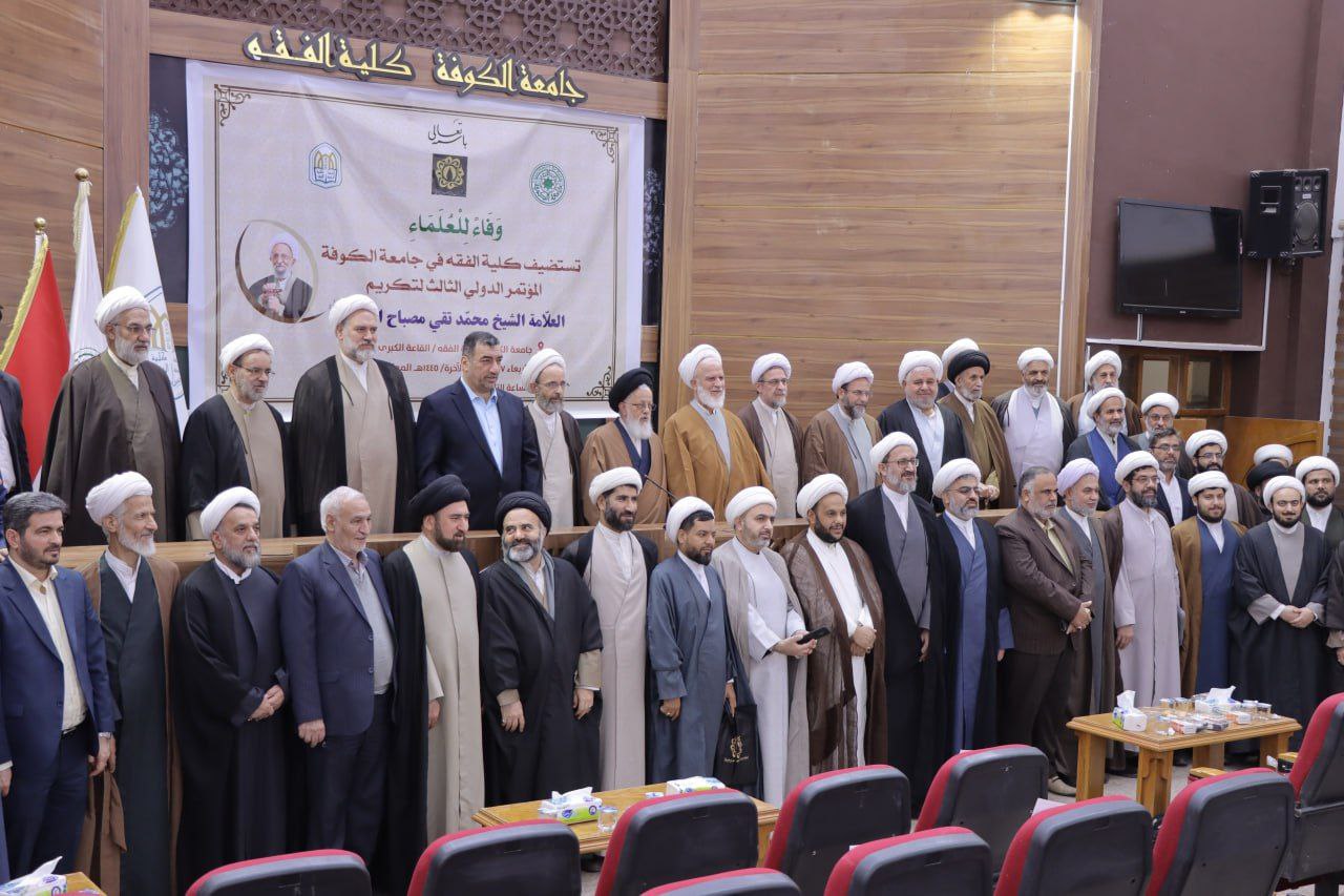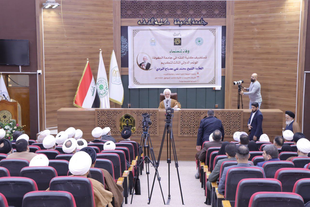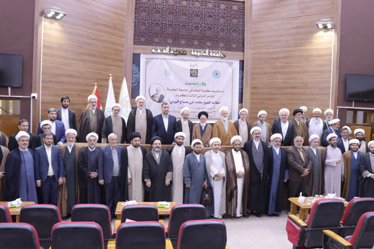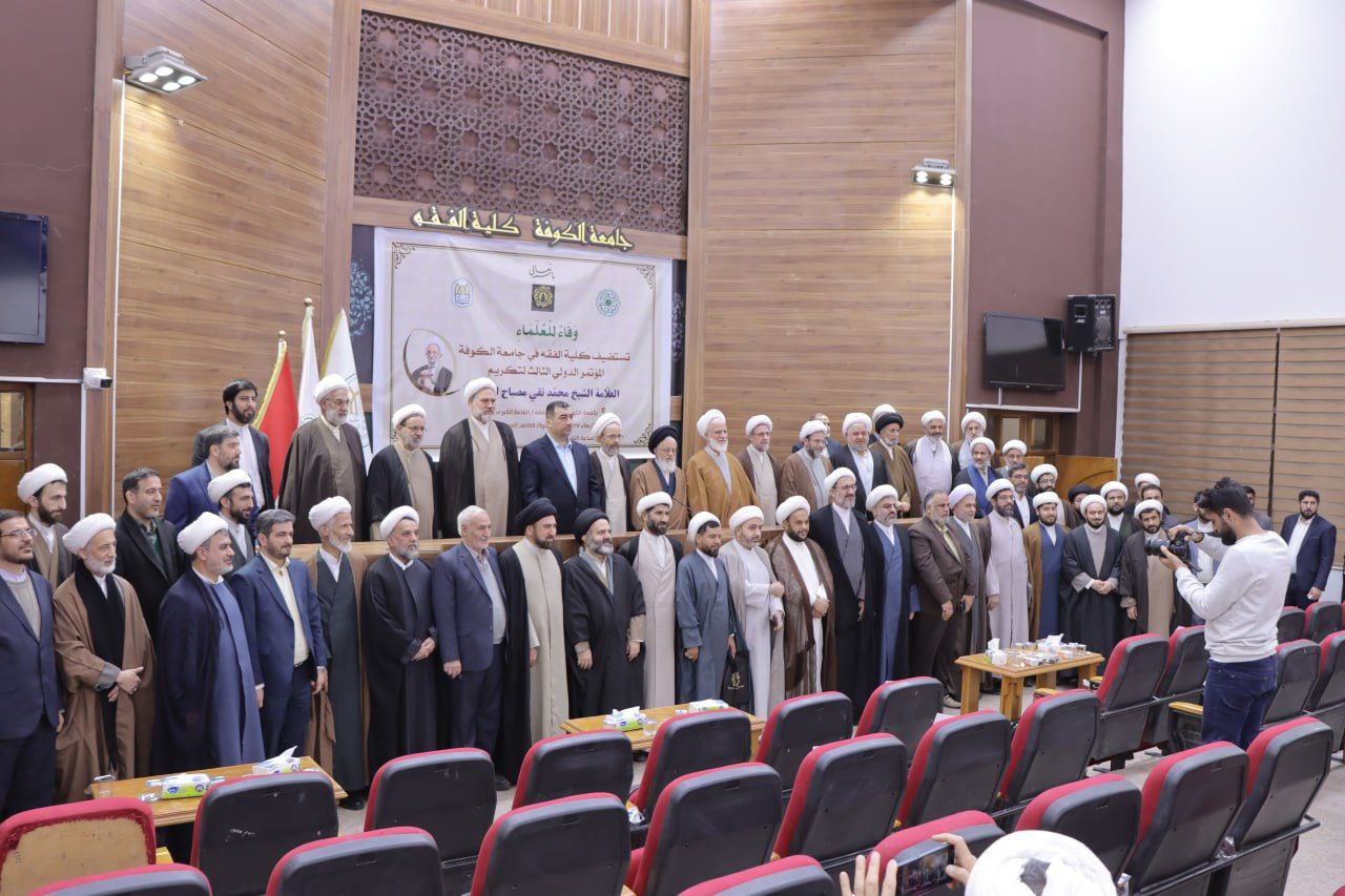 به گزارش خبرگزاری بین‌المللی اهل‌بیت(ع) ـ ابنا ـ همایش تجلیل از مقام شامخ علامه آیت الله مصباح یزدی با حضور علما، طلاب، اساتید، دانشجویان و نماینده مجمع جهانی اهل بیت(ع) در عراق در دانشکده فقه در دانشگاه کوفه برگزار شد. دکتر «سلیم جصانی» رئیس دانشکده فقه، این همایش را آغاز کرد و سپس حجت الاسلام و المسلمین «علی مصباح یزدی»، آیت الله «سید مجتبی حسینی» نماینده مقام معظم رهبری در عراق و آیت الله «محمدی عراقی» عضو شورای عالی مجمع جهانی اهل بیت(ع) به سخنرانی در خصوص شخصیت فلسفی، فقهی و اجتماعی علامه مصباح یزدی پرداختند.