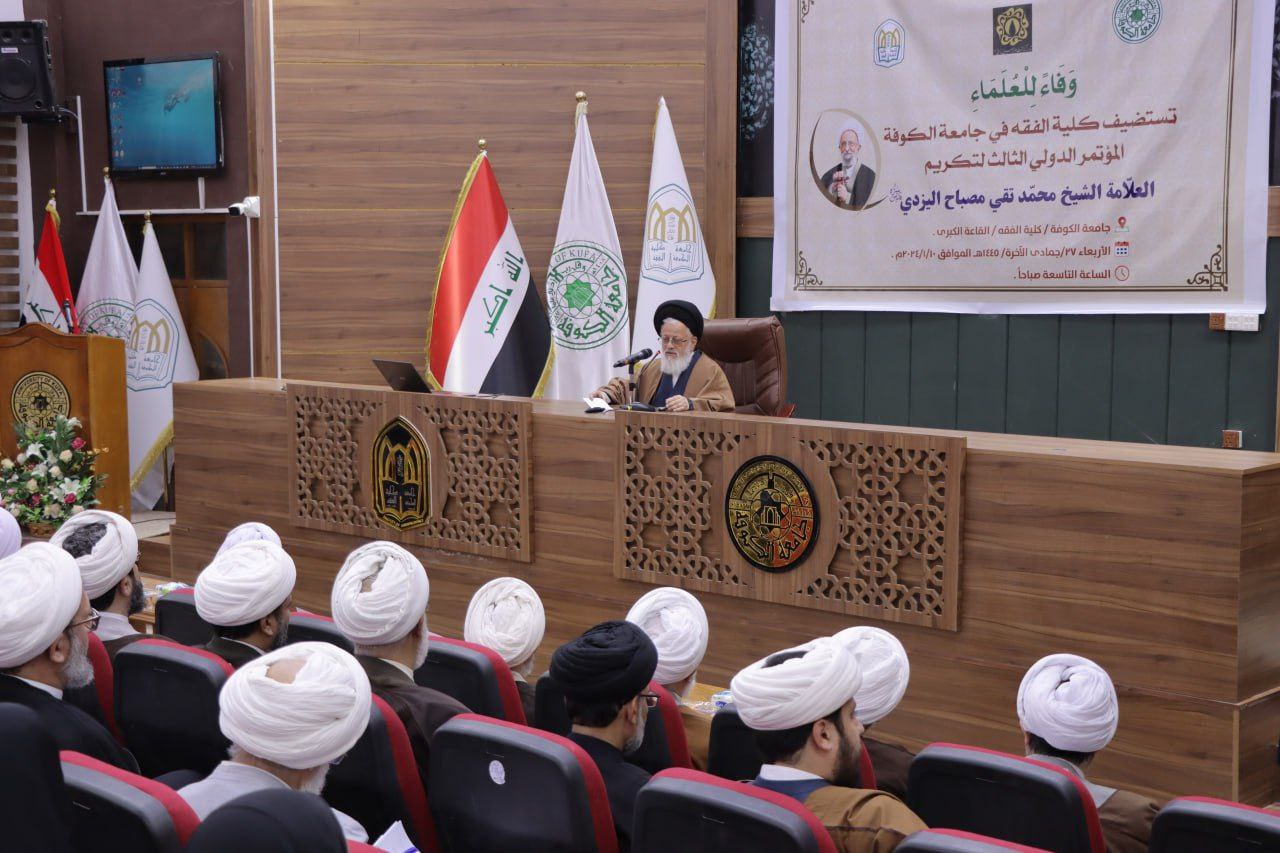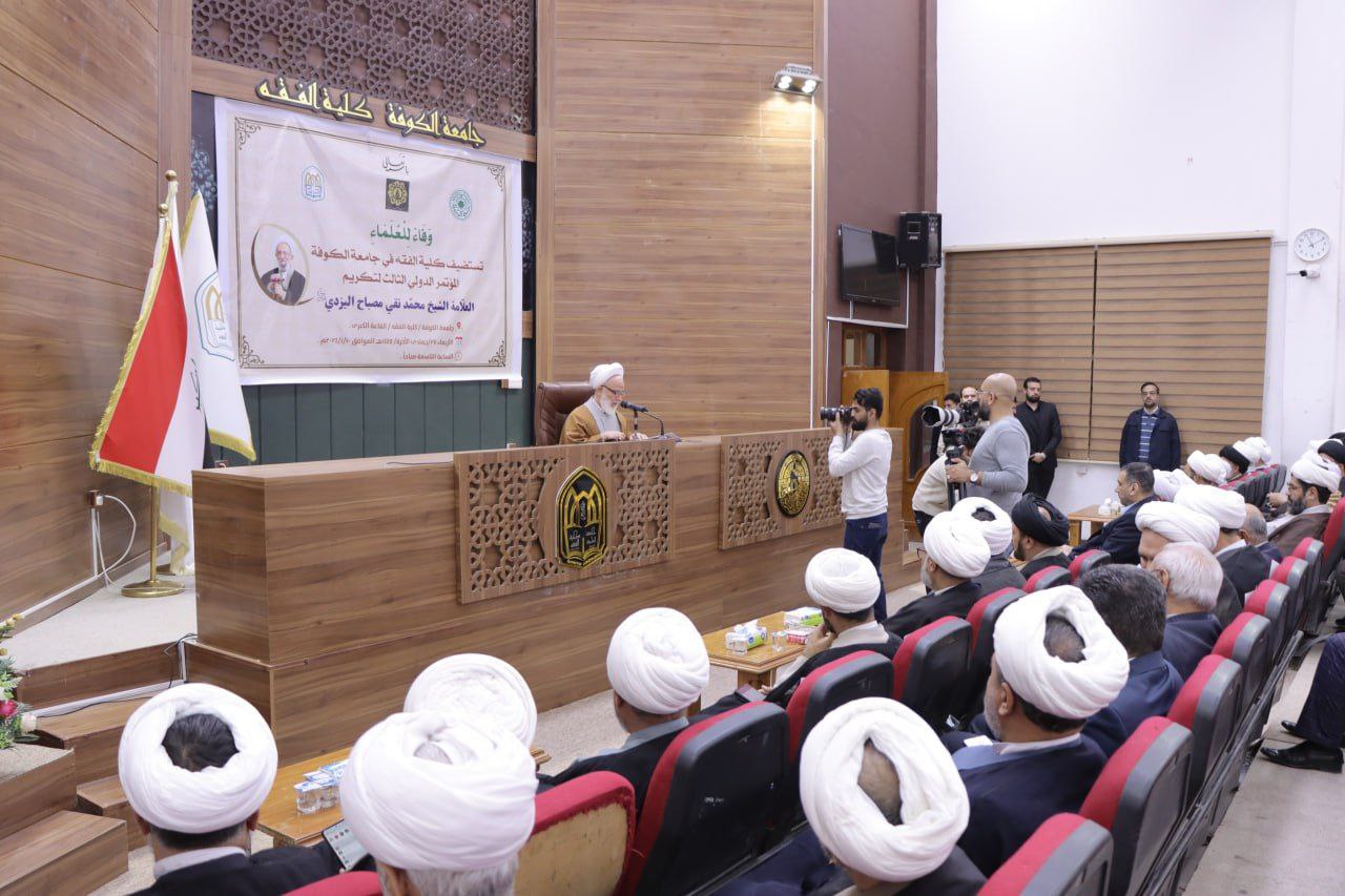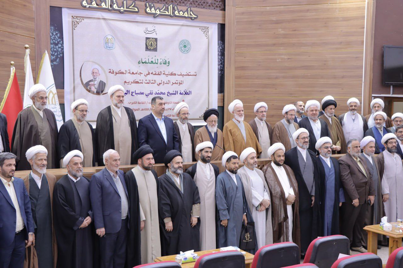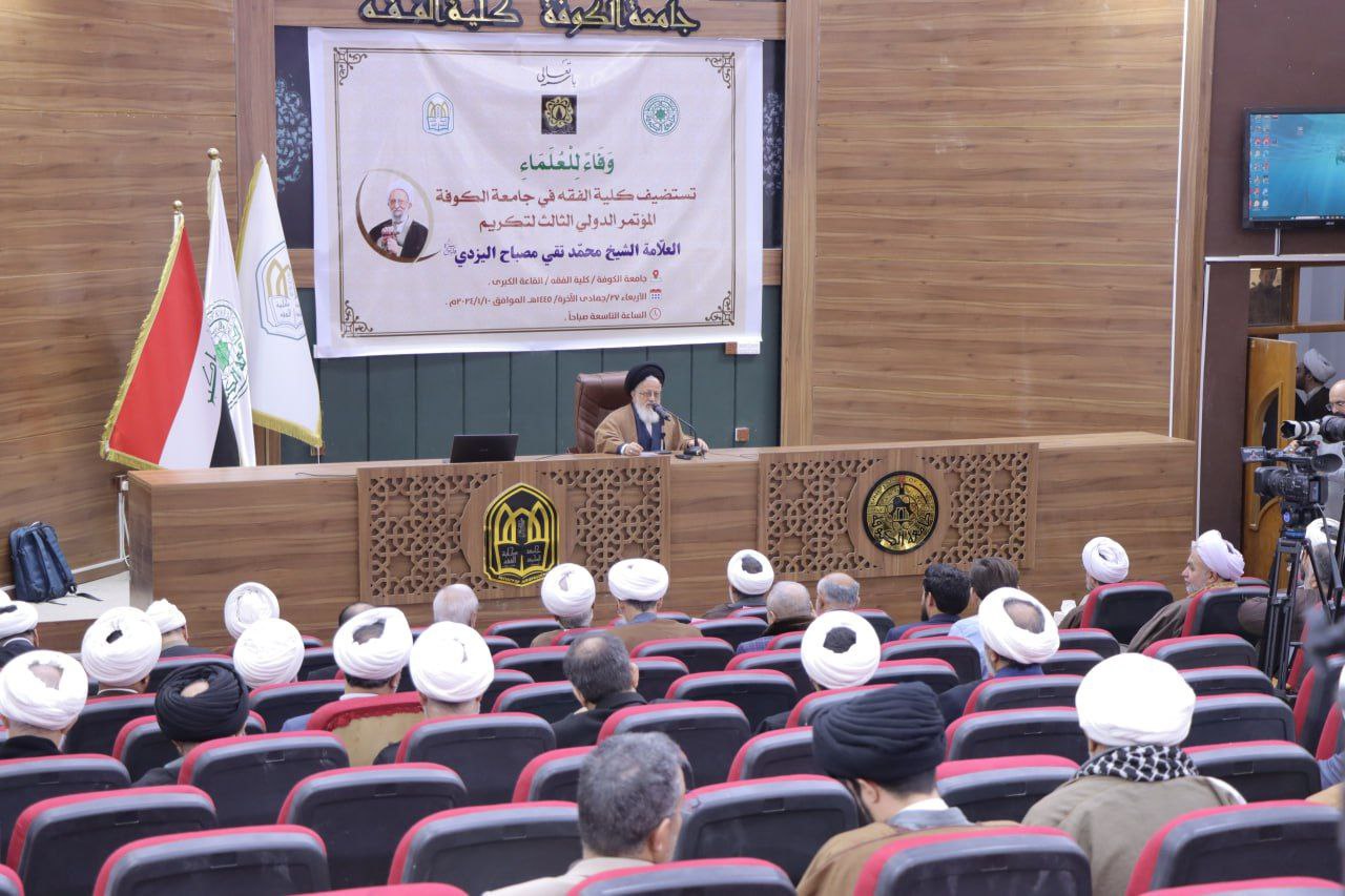 به گزارش خبرگزاری بین‌المللی اهل‌بیت(ع) ـ ابنا ـ همایش تجلیل از مقام شامخ علامه آیت الله مصباح یزدی با حضور علما، طلاب، اساتید، دانشجویان و نماینده مجمع جهانی اهل بیت(ع) در عراق در دانشکده فقه در دانشگاه کوفه برگزار شد. دکتر «سلیم جصانی» رئیس دانشکده فقه، این همایش را آغاز کرد و سپس حجت الاسلام و المسلمین «علی مصباح یزدی»، آیت الله «سید مجتبی حسینی» نماینده مقام معظم رهبری در عراق و آیت الله «محمدی عراقی» عضو شورای عالی مجمع جهانی اهل بیت(ع) به سخنرانی در خصوص شخصیت فلسفی، فقهی و اجتماعی علامه مصباح یزدی پرداختند.