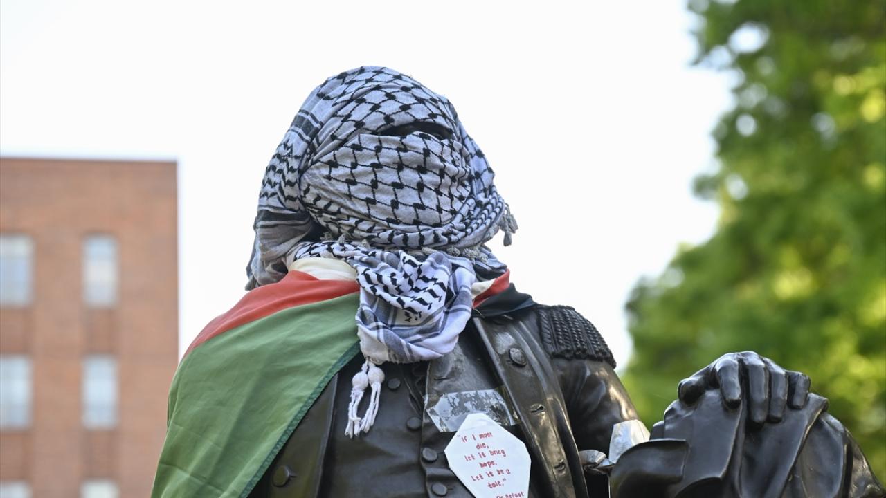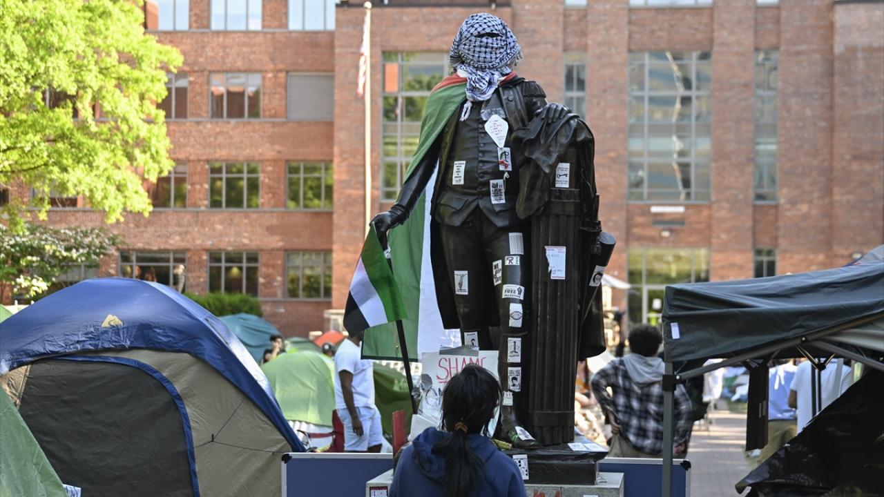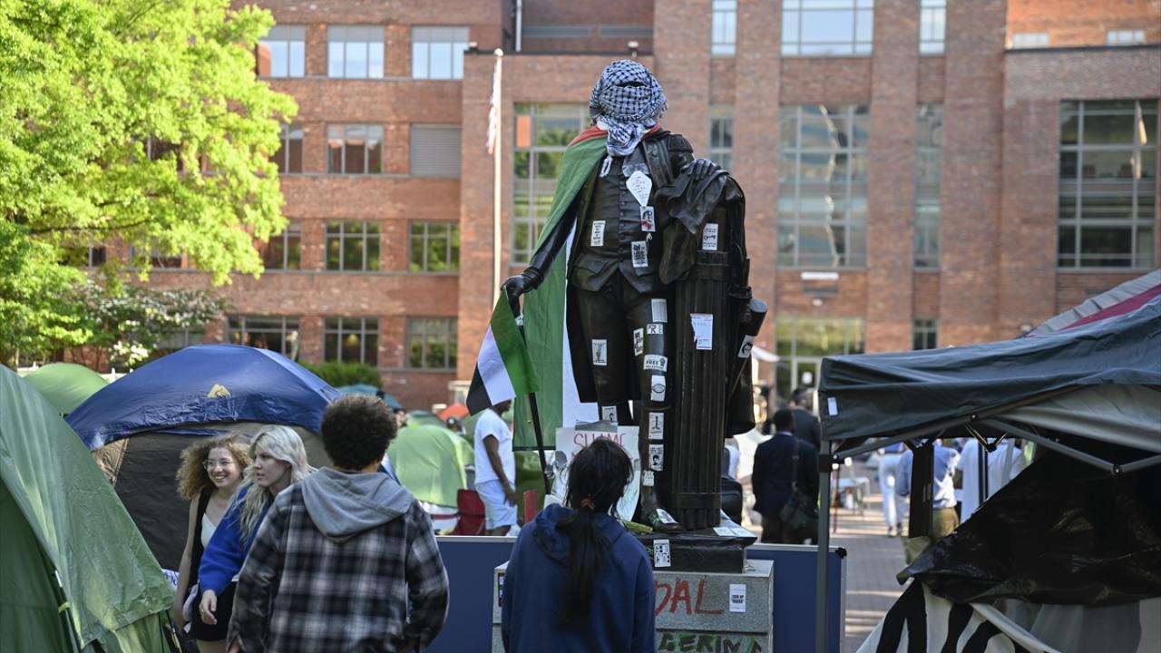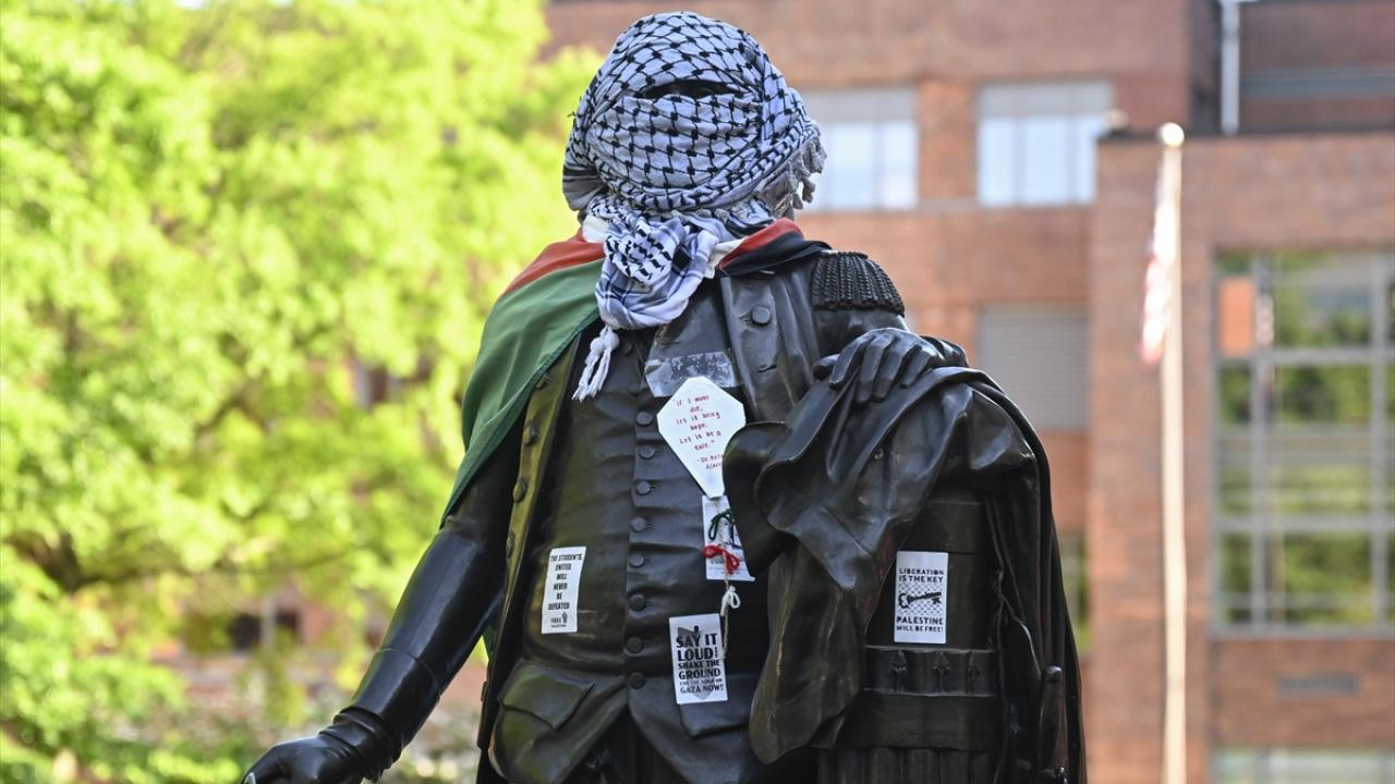 به گزارش خبرگزاری اهل بیت(ع) ـ ابنا ـ تجمع دانشجویان حامی فلسطین در دانشگاه جرج واشینگتن ادامه دارد. نکته قابل توجه در این تجمع، پوشاندن لباس و چفیه فلسطینی بر مجسمه جورج واشینگتن در محوطه این دانشگاه است.