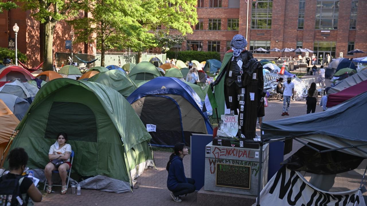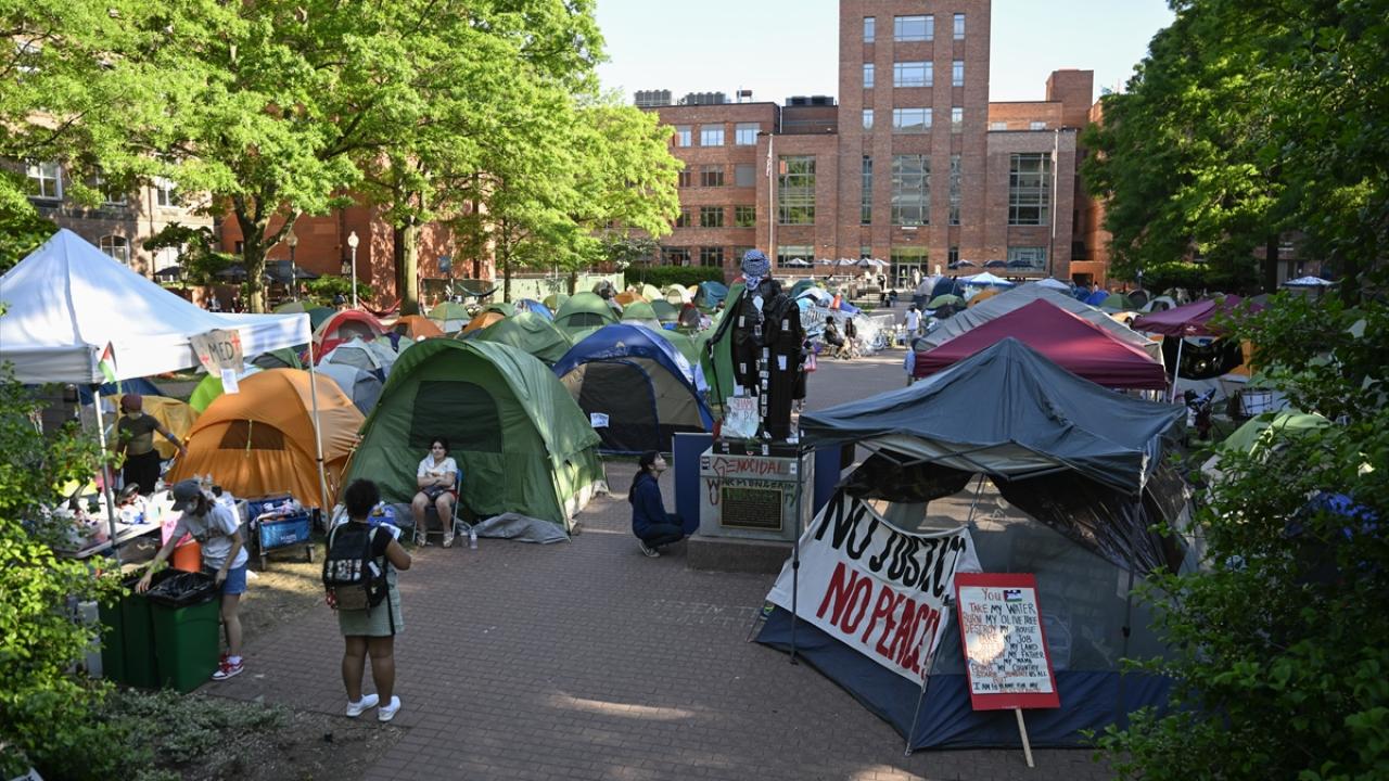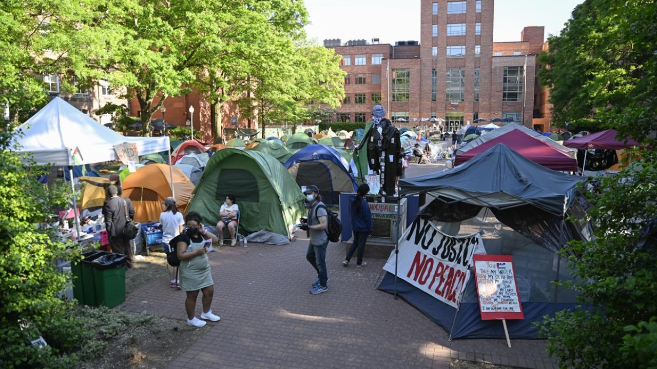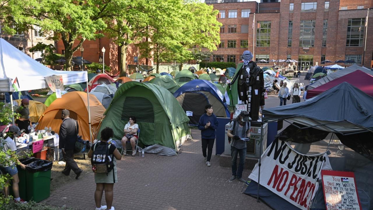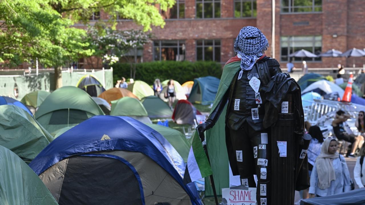 به گزارش خبرگزاری اهل بیت(ع) ـ ابنا ـ تجمع دانشجویان حامی فلسطین در دانشگاه جرج واشینگتن ادامه دارد. نکته قابل توجه در این تجمع، پوشاندن لباس و چفیه فلسطینی بر مجسمه جورج واشینگتن در محوطه این دانشگاه است.