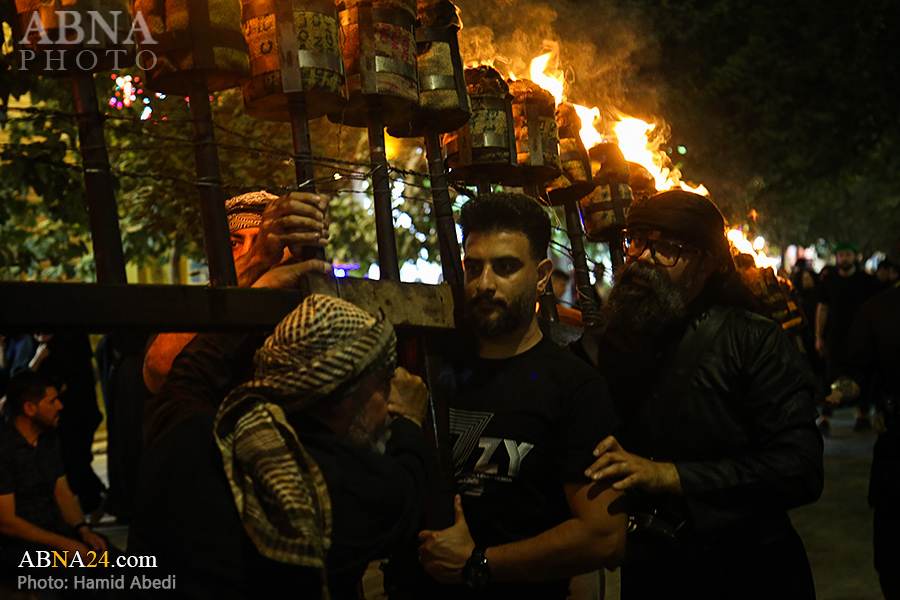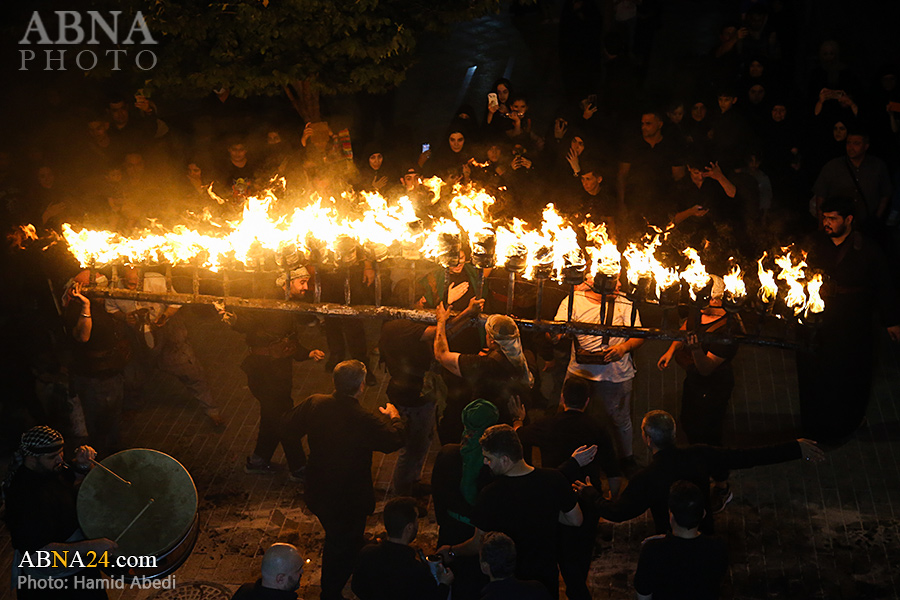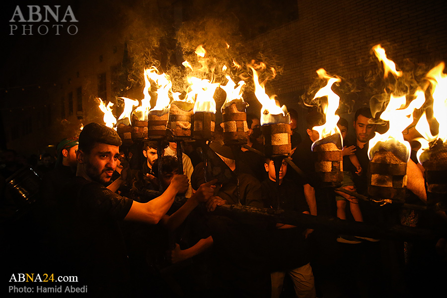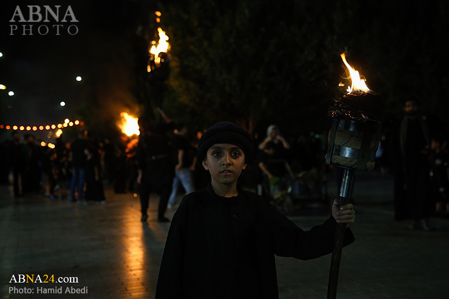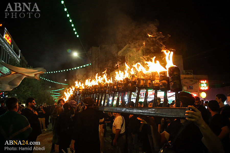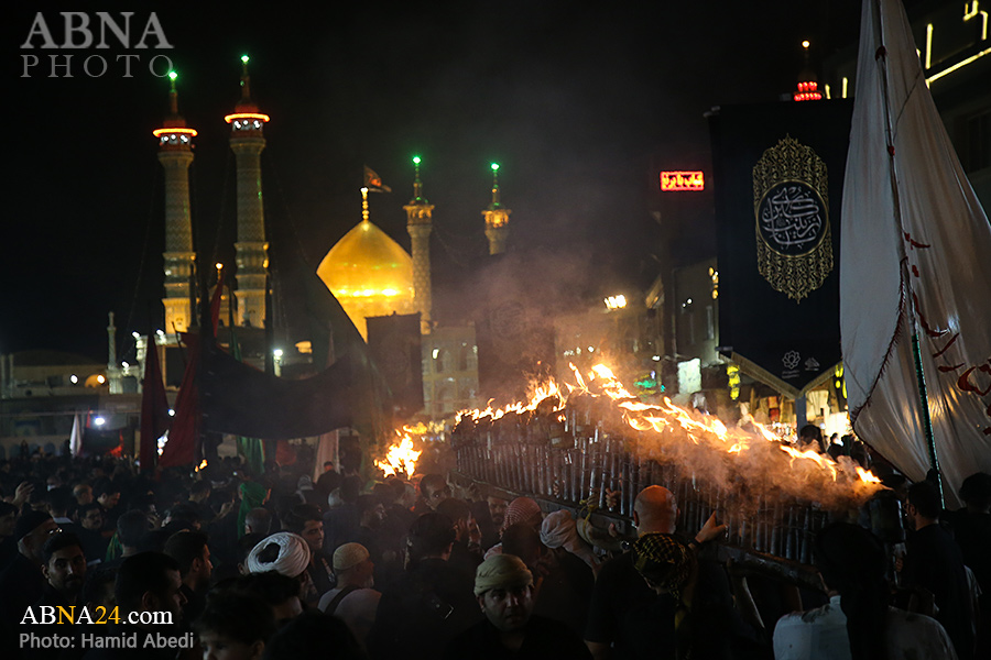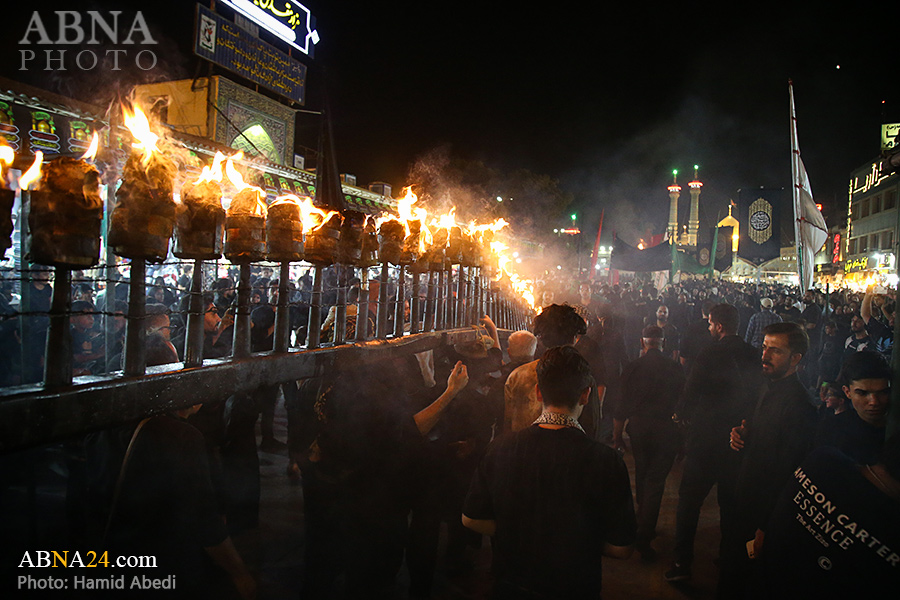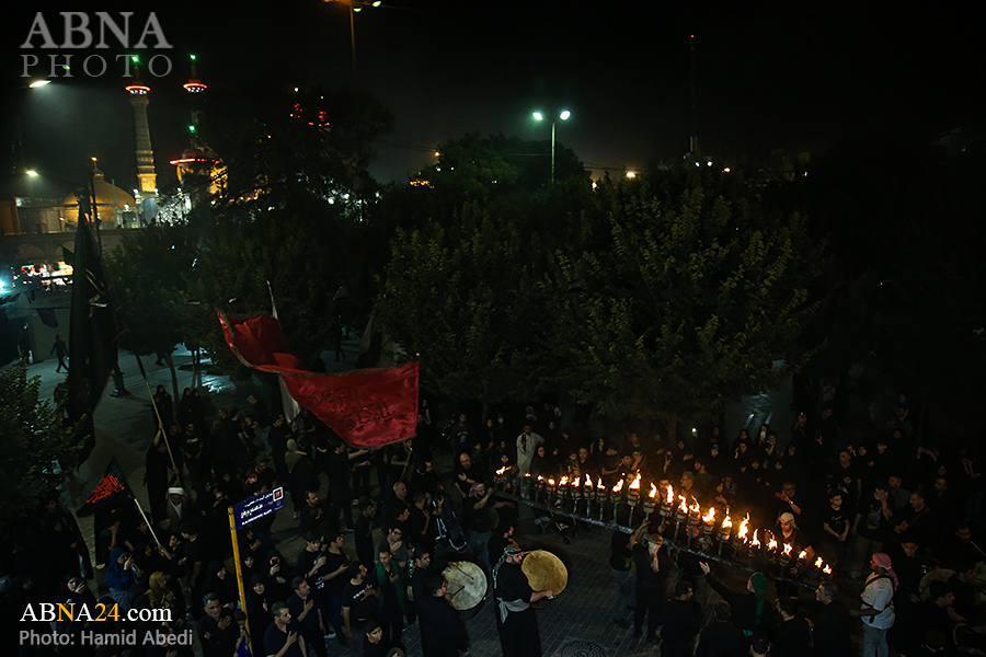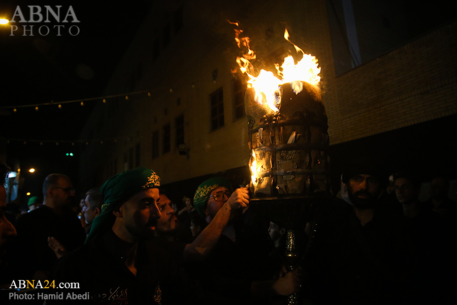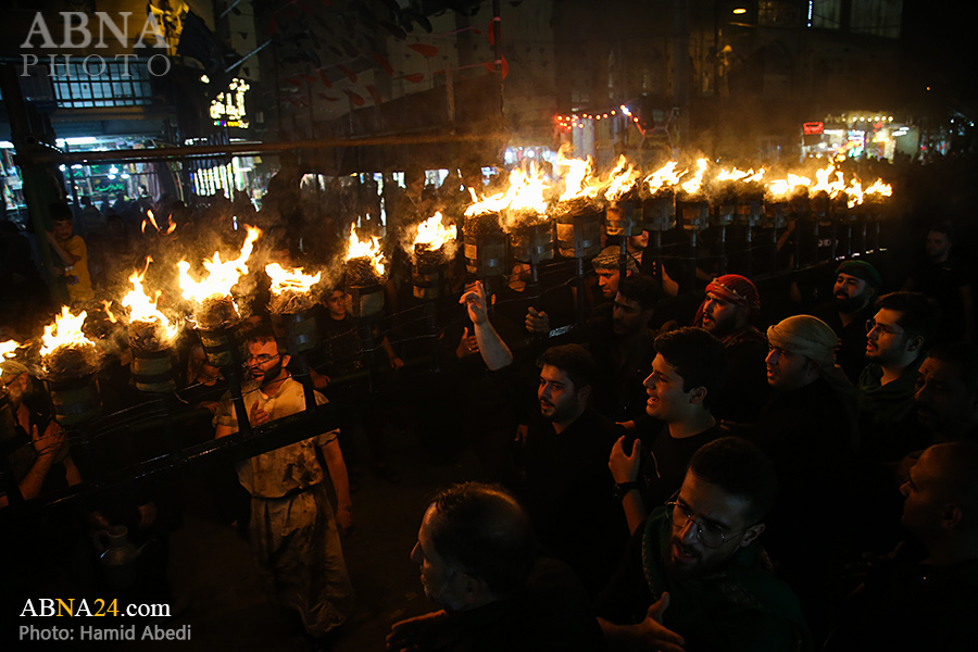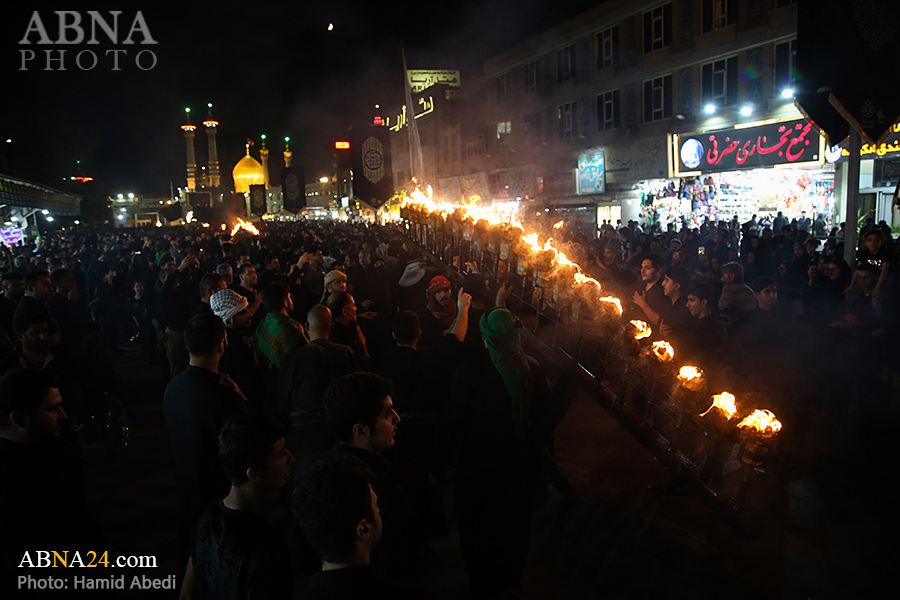 به گزارش خبرگزاری بین‌المللی اهل‌بیت(ع) ـ ابنا ـ آیین سنتی مشعل گردانی نجفی های مقیم قم امشب شنبه ۲۳ تیر ۱۴۰۳ مصادف با شب هشتم محرم الحرام به سمت حرم حضرت فاطمه معصومه (س) برگزار شد. مشعل‌های حمل شده در این مراسم نمادی از مشعل‌هایی هستند که خیمه گاه اباعبدالله الحسین (علیه‌السلام) را به آتش کشیدند و نواختن گسترده طبل‌ها نیز یادآور نواختن طبل در زمان حمله لشگر یزید به خیمه‌گاه و اهل حرم است که با صدای بلند نواختن طبل مانع از شنیده شدن صدای زنان و کودکان شدند.