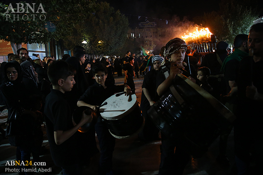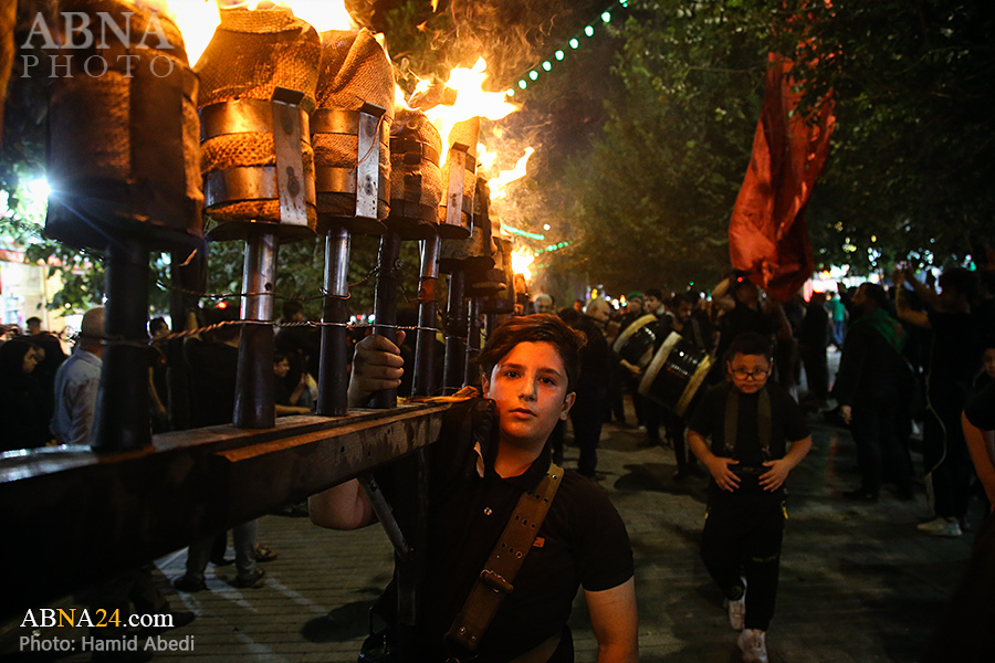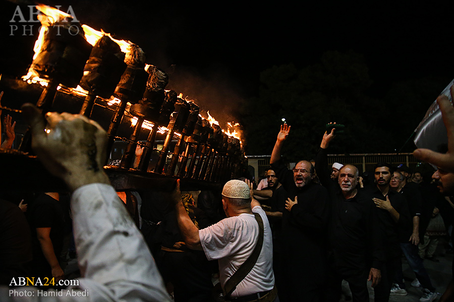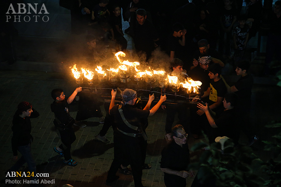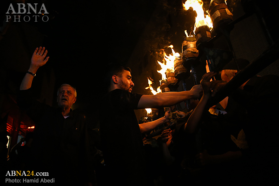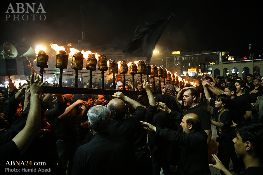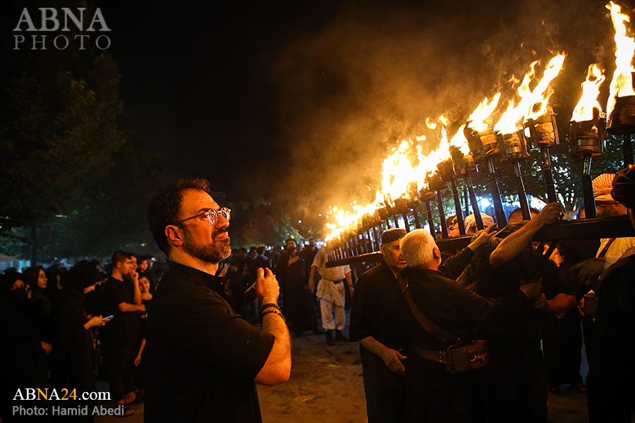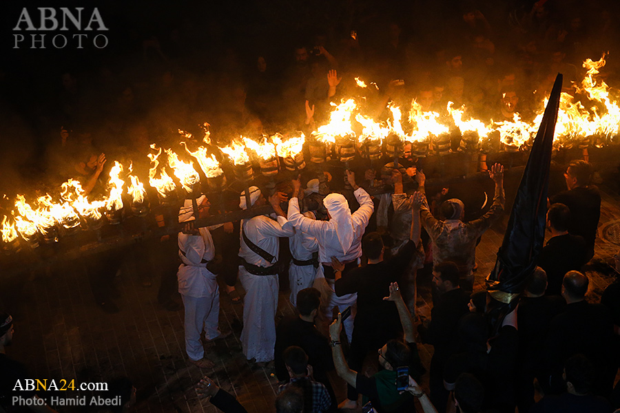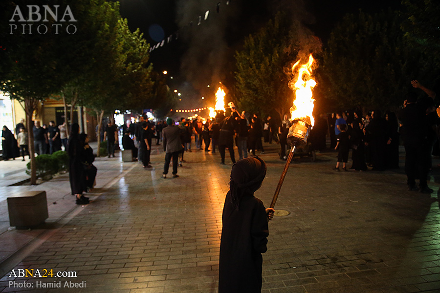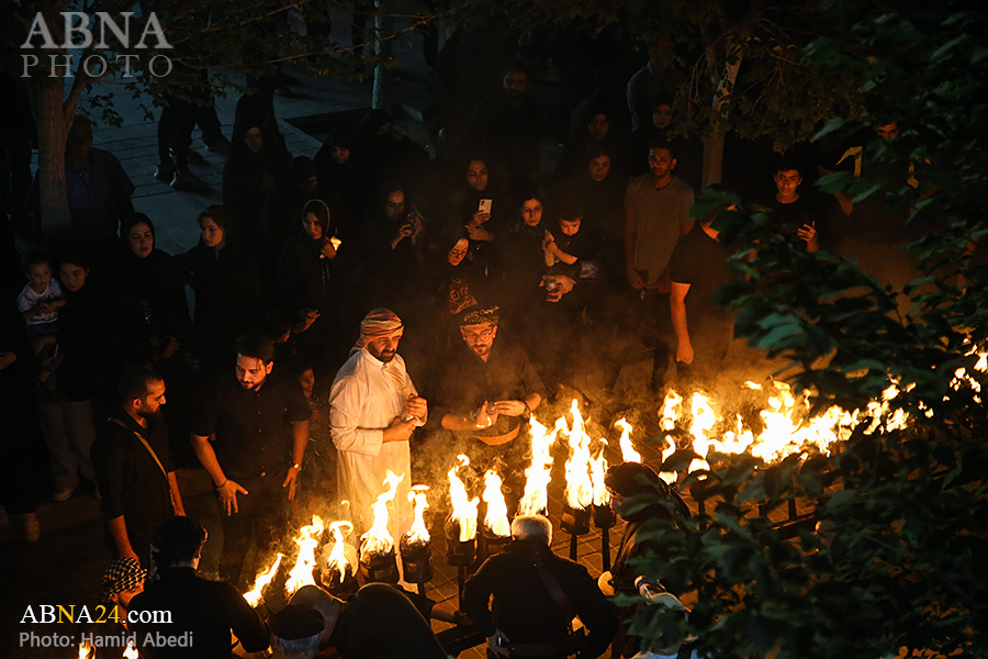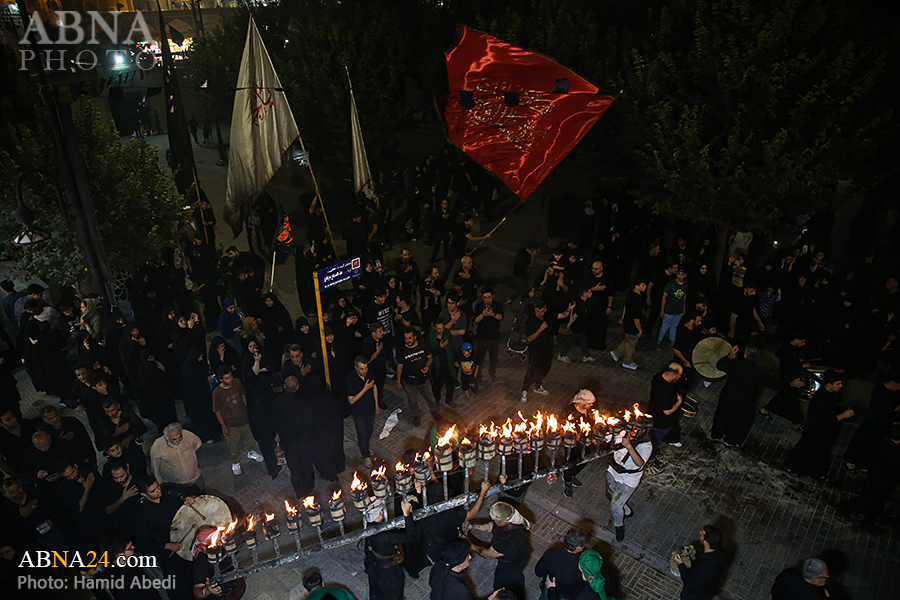 به گزارش خبرگزاری بین‌المللی اهل‌بیت(ع) ـ ابنا ـ آیین سنتی مشعل گردانی نجفی های مقیم قم امشب شنبه ۲۳ تیر ۱۴۰۳ مصادف با شب هشتم محرم الحرام به سمت حرم حضرت فاطمه معصومه (س) برگزار شد. مشعل‌های حمل شده در این مراسم نمادی از مشعل‌هایی هستند که خیمه گاه اباعبدالله الحسین (علیه‌السلام) را به آتش کشیدند و نواختن گسترده طبل‌ها نیز یادآور نواختن طبل در زمان حمله لشگر یزید به خیمه‌گاه و اهل حرم است که با صدای بلند نواختن طبل مانع از شنیده شدن صدای زنان و کودکان شدند.