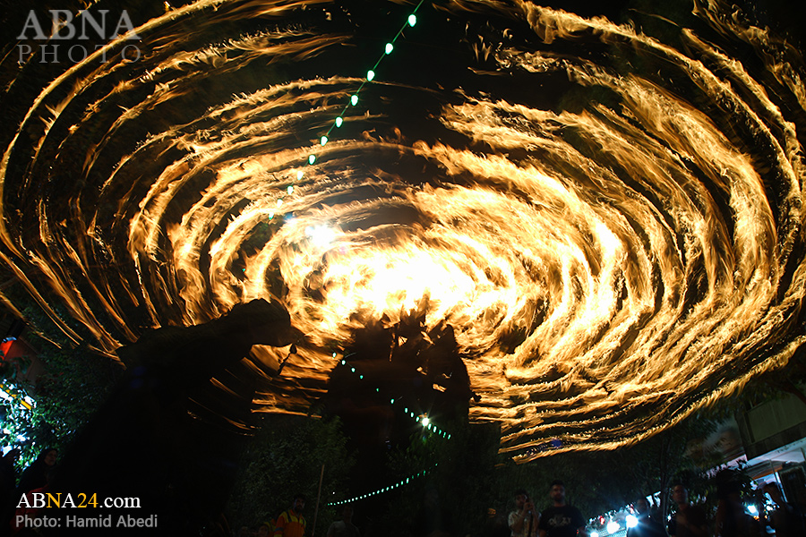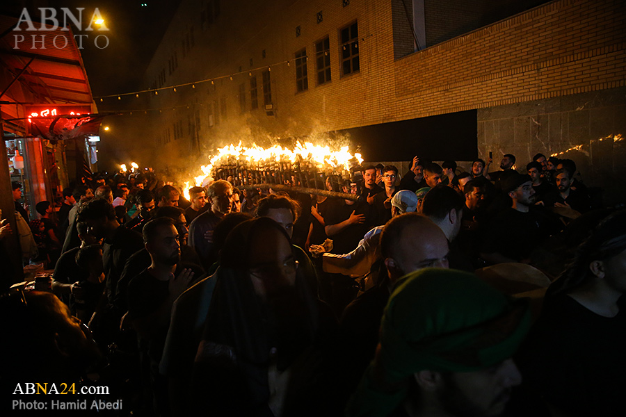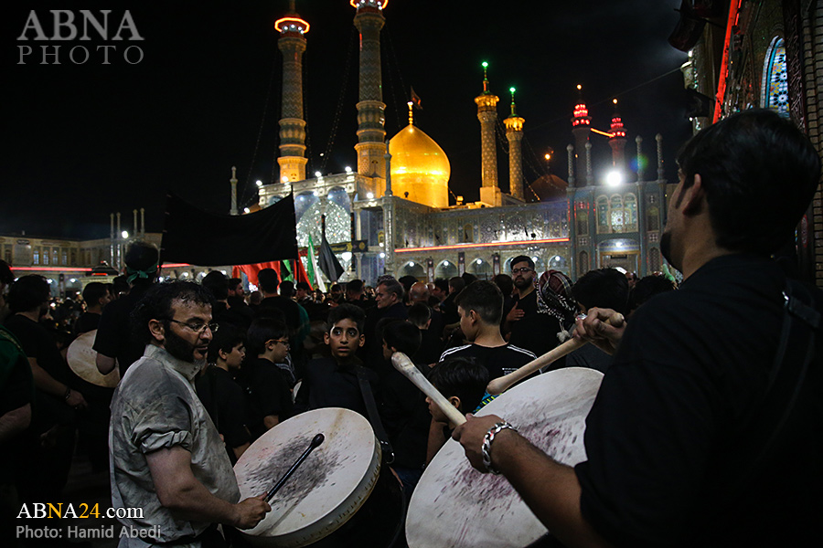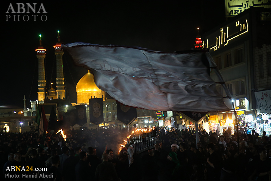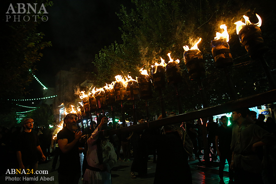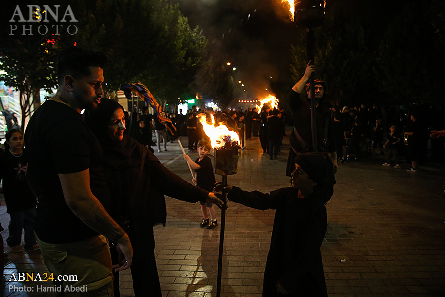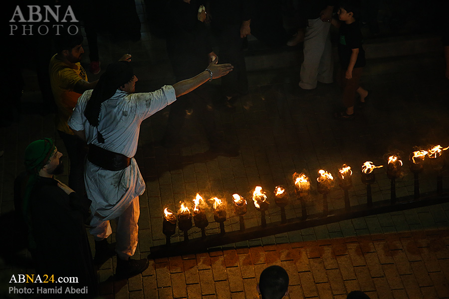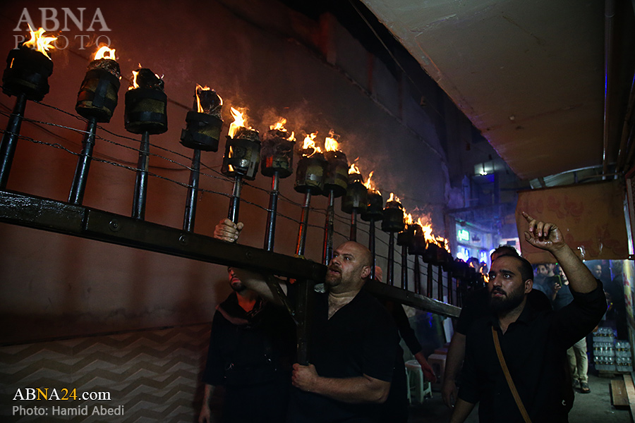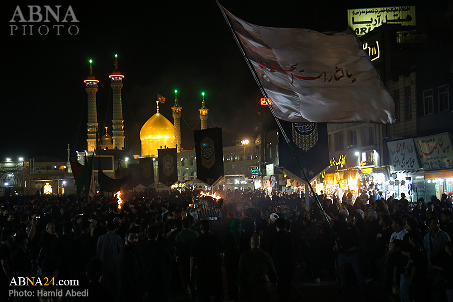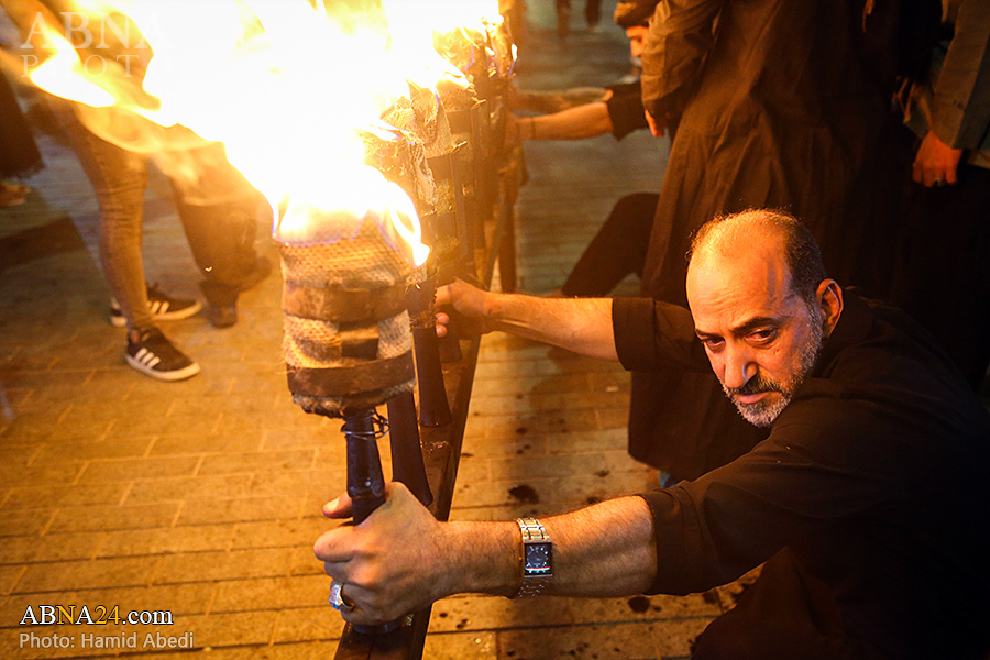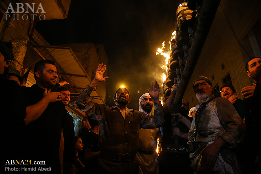 به گزارش خبرگزاری بین‌المللی اهل‌بیت(ع) ـ ابنا ـ آیین سنتی مشعل گردانی نجفی های مقیم قم امشب شنبه ۲۳ تیر ۱۴۰۳ مصادف با شب هشتم محرم الحرام به سمت حرم حضرت فاطمه معصومه (س) برگزار شد. مشعل‌های حمل شده در این مراسم نمادی از مشعل‌هایی هستند که خیمه گاه اباعبدالله الحسین (علیه‌السلام) را به آتش کشیدند و نواختن گسترده طبل‌ها نیز یادآور نواختن طبل در زمان حمله لشگر یزید به خیمه‌گاه و اهل حرم است که با صدای بلند نواختن طبل مانع از شنیده شدن صدای زنان و کودکان شدند.