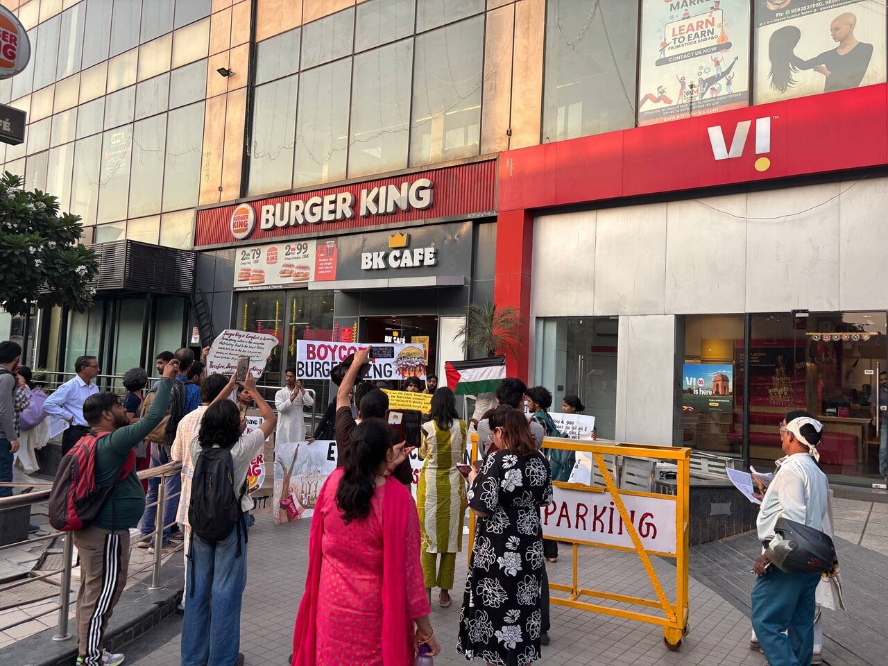تجمع اعتراضی حامیان فلسطین در دهلینو مقابل شعبه برگر کینگ، در واکنش به حمایت این شرکت از اسرائیل و توزیع گسترده کوپنهای غذایی برای نظامیان اسرائیلی برگزار شد.