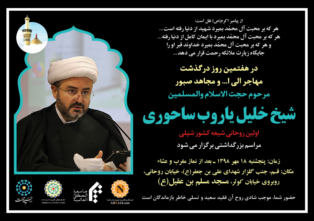 به گزارش خبرگزاری اهل بیت(ع) ـ ابنا ـ مراسم هفتمین شب درگذشت حجت الاسلام شیخ «خلیل یاروب ساحوری» اولین روحانی شیعه کشور شیلی شامگاه امروز پنج شنبه 18 مهر 1398 در مسجد مسلم بن عقیل در شهر قم برگزار شد. در این مراسم که از سوی مجمع جهانی اهل بیت(ع)، جامعة المصطفی(ص) العالمیة، خبرگزاری ابنا و مؤسسه نسیم رحمت برپا گردید، آیت الله «محسن قمی» عضو شورای عالی مجمع جهانی اهلبیت(ع) و معاون بین الملل دفتر مقام معظم رهبری، حجت الاسلام و المسلمین دکتر «ایمانی مقدم» معاون امور فرهنگی مجمع جهانی اهل بیت(ع)، حجت الاسلام و المسلمین «کشاورز» مدیر امور طلاب آمریکای لاتین جامعة المصطفی(ص)، حجت الاسلام والمسلمین «حسینی عارف» مدیرعامل خبرگزاری ابنا، حجت الاسلام والمسلمین «فیصل مرهل» از علمای شیعه کشور آرژانتین و جمعی از طلاب ایرانی و غیرایرانی حضور داشتند. سخنران این مراسم حجت الاسلام استاد «سهیل اسعد» اندیشمند و مبلغ آرژانتینی بود که در سخنانی به زندگی شیخ خلیل ساحوری و مجاهدت های او در راه کسب علوم اسلامی و تبلیغ معارف قرآن و عترت پرداخت.