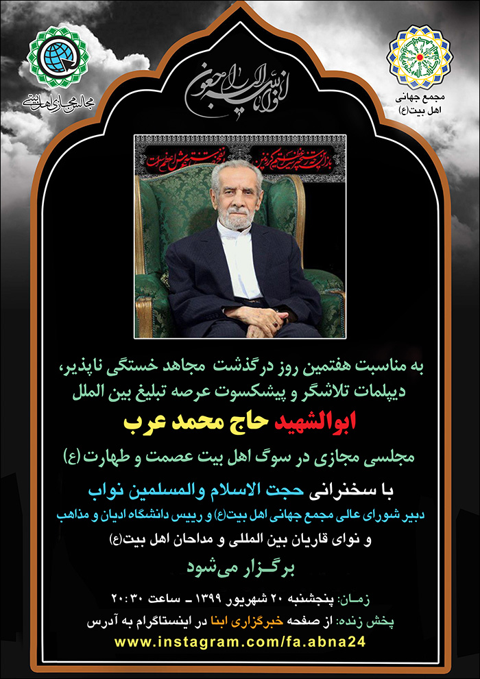 به گزارش خبرگزاری اهلبیت(ع) ـ ابنا ـ سی و هفتمین مجلس از مجالس مجازی اهل بیتی در هفتمین روز درگذشت مرحوم حاج «محمد عرب» رییس اسبق دفتر قمِ مجمع جهانی اهل بیت(ع) و اولین شهردار قم پس از انقلاب اسلامی، برگزار شد. در این مراسم که همزمان با شب بیست و دوم ماه محرم الحرام (شامگاه روز پنجشنبه 20 شهریور اردیبهشت 1399) و به همت مجمع جهانی اهل بیت(ع) و خبرگزاری ابنا برپا گردید، حجت الاسلام والمسلمین «سید ابوالحسن نواب» دبیر شورای عالی مجمع جهانی اهل بیت(ع) و همکار قدیمی آن مرحوم، به ایراد سخن پرداخت. همچنین در این مراسم استاد «علی علیزاده» قاری بین المللی آیاتی از کلام الله مجید قرائت کرد و حاج «حسن اسداللهی» مداح اهل بیت(ع) مرثیه خوانی نمود. این مجلس به طور زنده از صفحه خبرگزاری ابنا دراینستاگرام پخش شد و فیلم کامل آن در سایت ابنا و نیز صفحه این خبرگزاری در شبکه های اجتماعی اینستاگرام و آپارات قابل دسترسی است.